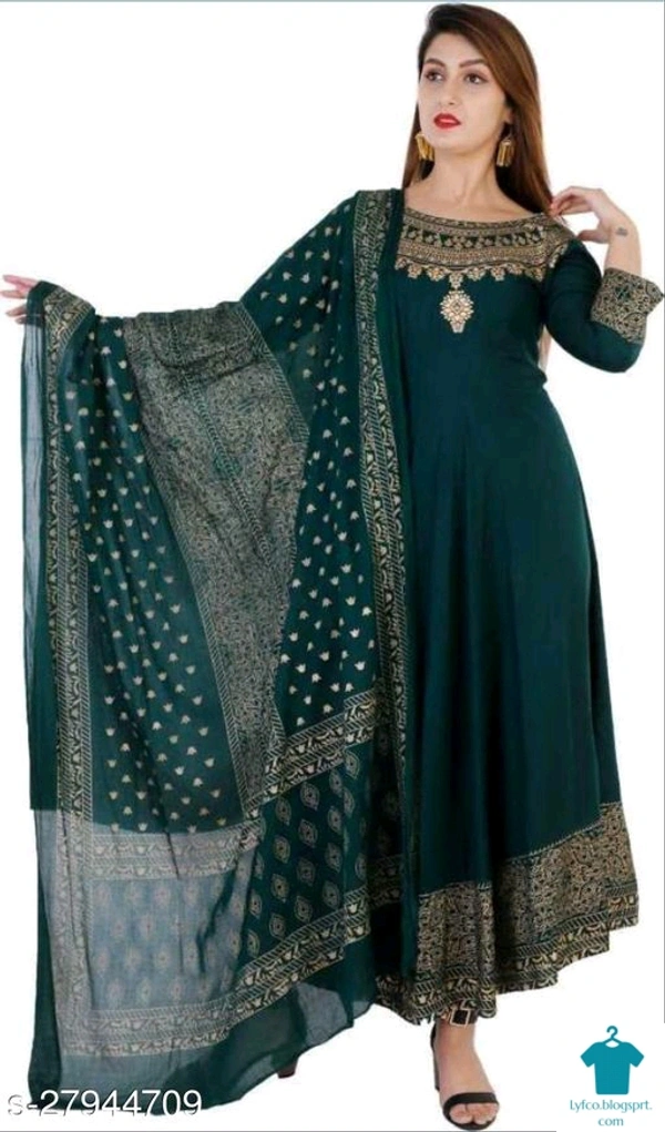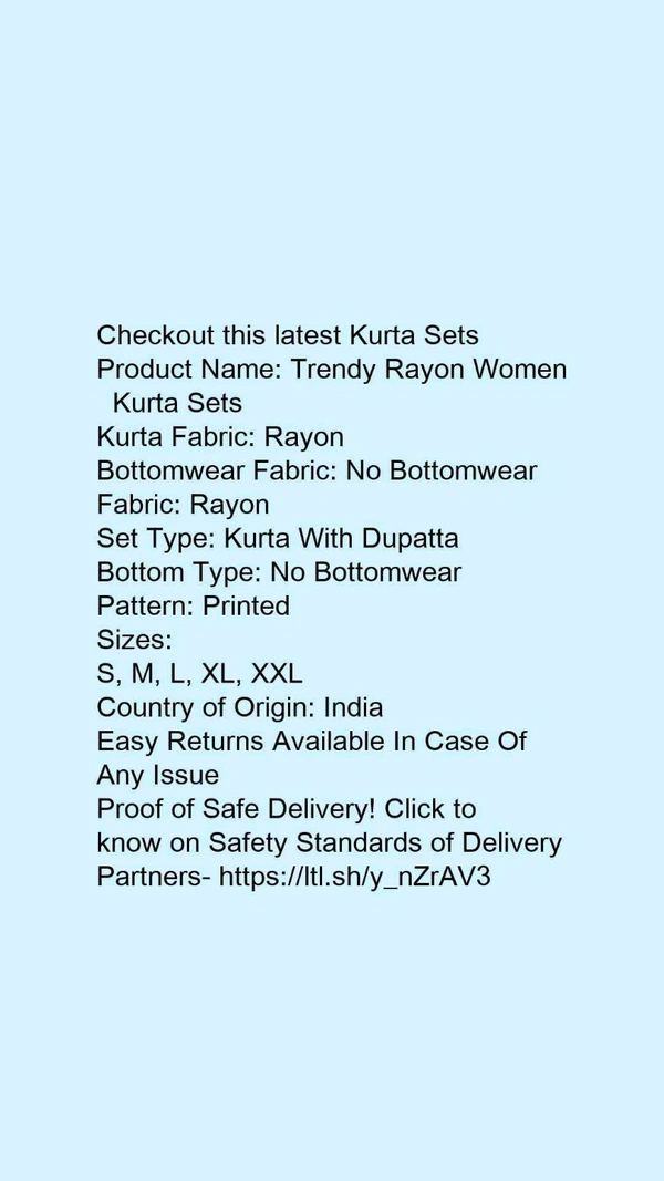 Product Name: *Trendy Rayon Women Kurta Sets*Kurta Fabric: RayonBottomwear Fabric: No BottomwearFabric: RayonSet Type: Kurta With DupattaBottom Type: No BottomwearPattern: Printed