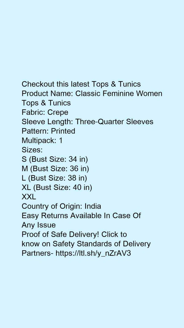 Product Name: *Trendy Retro Women Tops & Tunics*Fabric: CrepeSleeve Length: Three-Quarter SleevesPattern: PrintedMultipack: 1