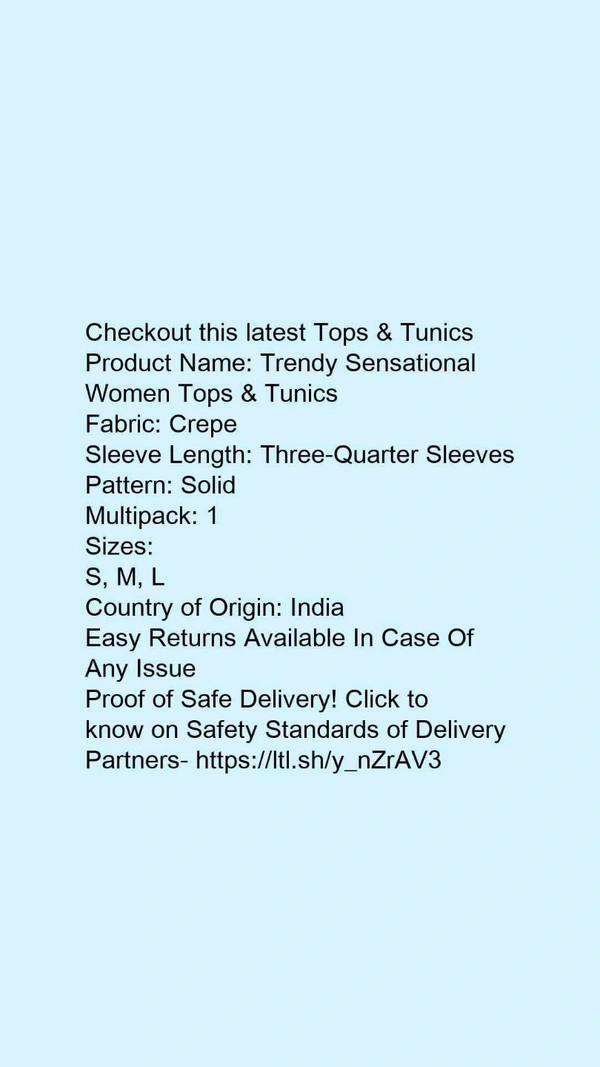 Product Name: *Trendy Sensational Women Tops & Tunics*Fabric: CrepeSleeve Length: Three-Quarter SleevesPattern: SolidMultipack: 1