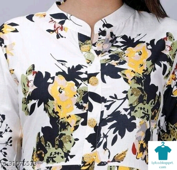 Product Name: *Trendy White Premium Yellow Flower Design Flared Kurti*Fabric: RayonSleeve Length: Three-Quarter SleevesPattern: PrintedCombo of: Single