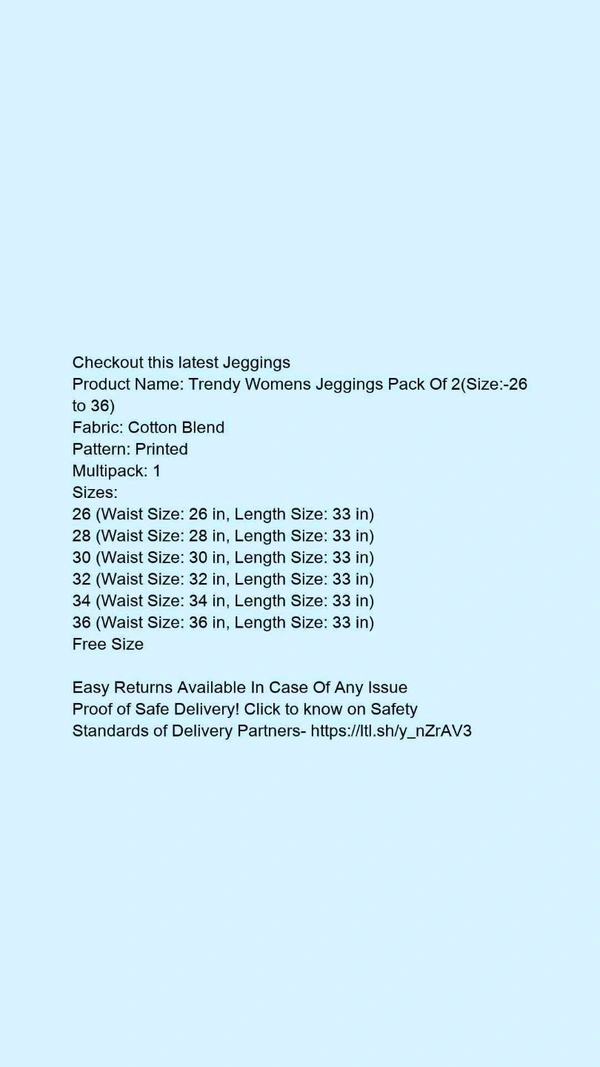 Product Name: *Trendy Womens Jeggings Pack Of 2(Size:-26 to 36)*Fabric: Cotton BlendPattern: PrintedMultipack: 1