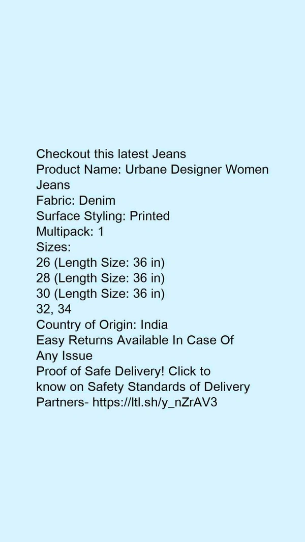 Product Name: *Urbane Designer Women Jeans*Fabric: DenimSurface Styling: PrintedMultipack: 1