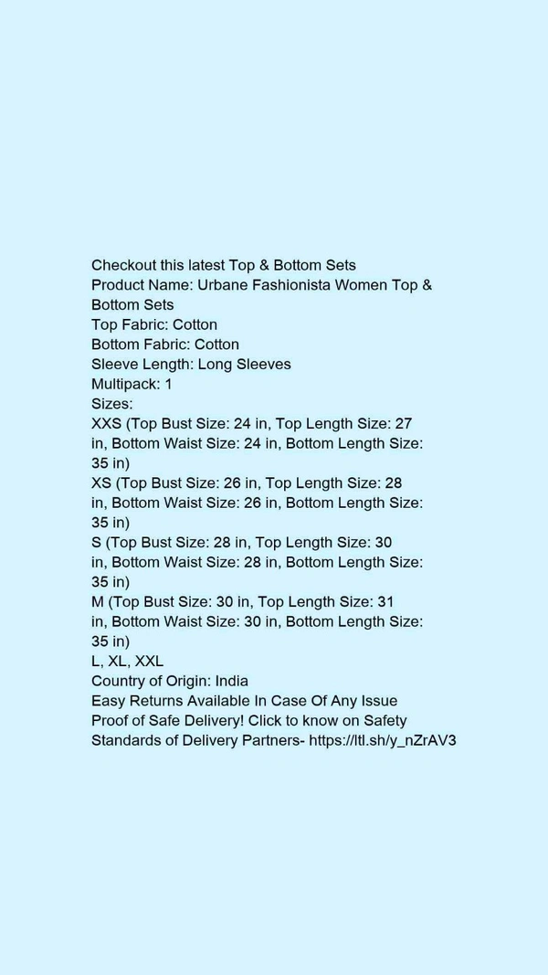 Product Name: *Urbane Fashionista Women Top & Bottom Sets*Top Fabric: CottonBottom Fabric: CottonSleeve Length: Long SleevesMultipack: 1