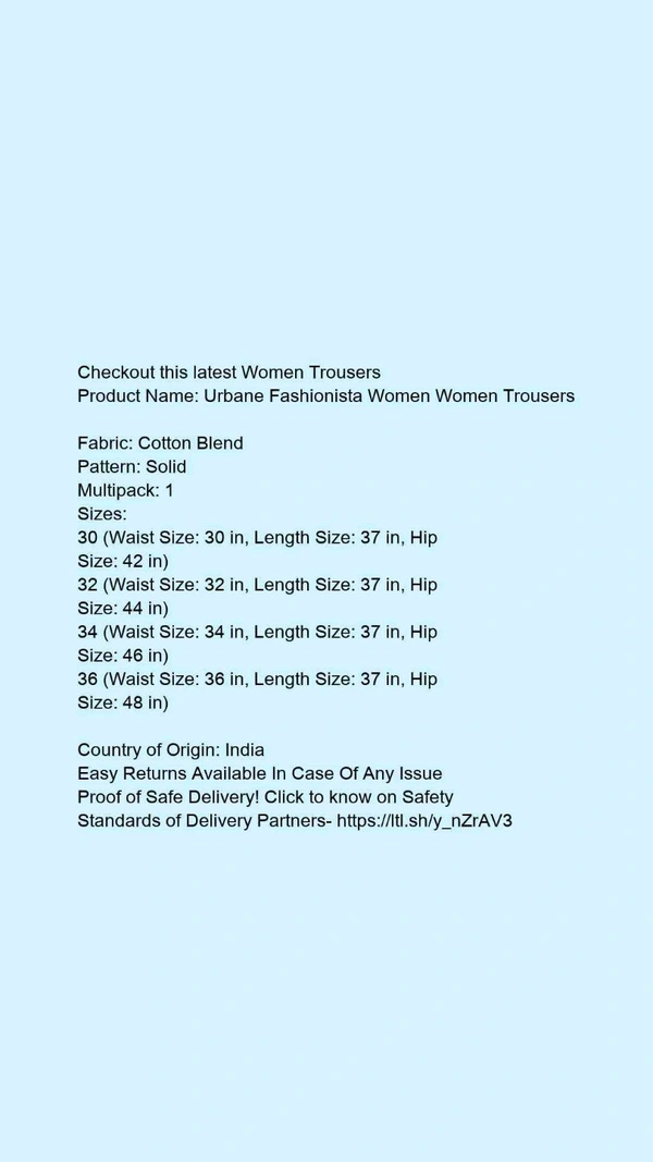 Product Name: *Urbane Fashionista Women Women Trousers *Fabric: Cotton BlendPattern: SolidMultipack: 1
