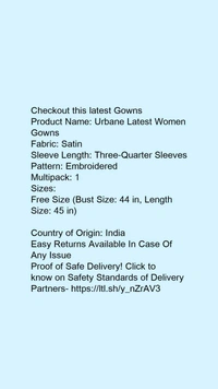 Product Name: *Urbane Latest Women Gowns*Fabric: SatinSleeve Length: Three-Quarter SleevesPattern: EmbroideredMultipack: 1