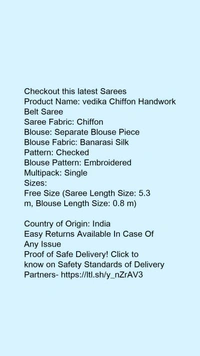 Product Name: *vedika Chiffon Handwork Belt Saree*Saree Fabric: ChiffonBlouse: Separate Blouse PieceBlouse Fabric: Banarasi SilkPattern: CheckedBlouse Pattern: EmbroideredMultipack: Single