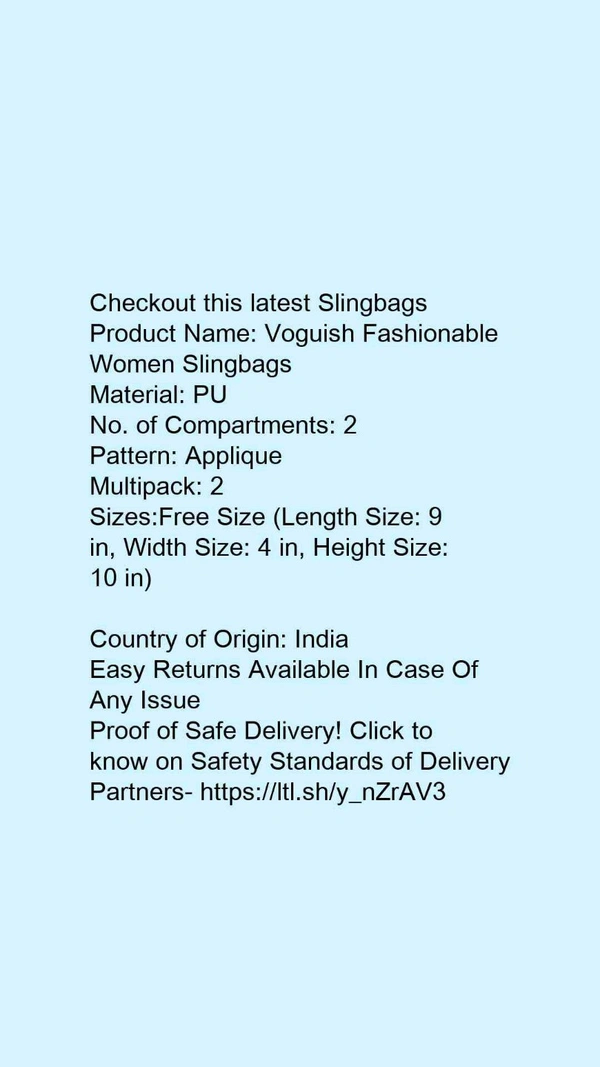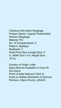 Product Name: *Voguish Fashionable Women Slingbags*Material: PUNo. of Compartments: 2Pattern: AppliqueMultipack: 2