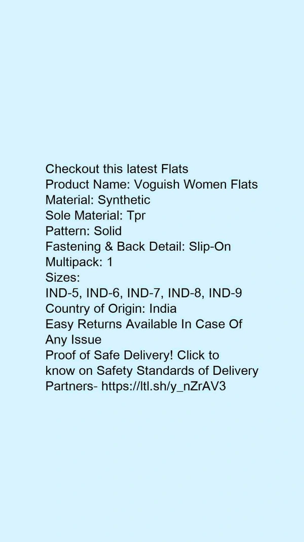 Product Name: *Voguish Women Flats*Material: SyntheticSole Material: TprPattern: SolidFastening & Back Detail: Slip-OnMultipack: 1