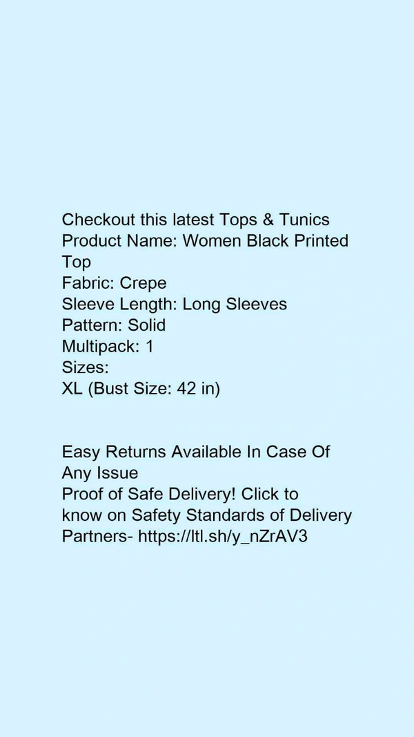 Product Name: *Women Black Printed Top*Fabric: CrepeSleeve Length: Long SleevesPattern: SolidMultipack: 1