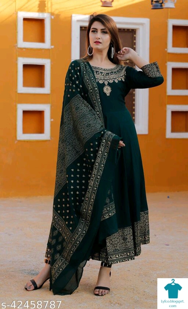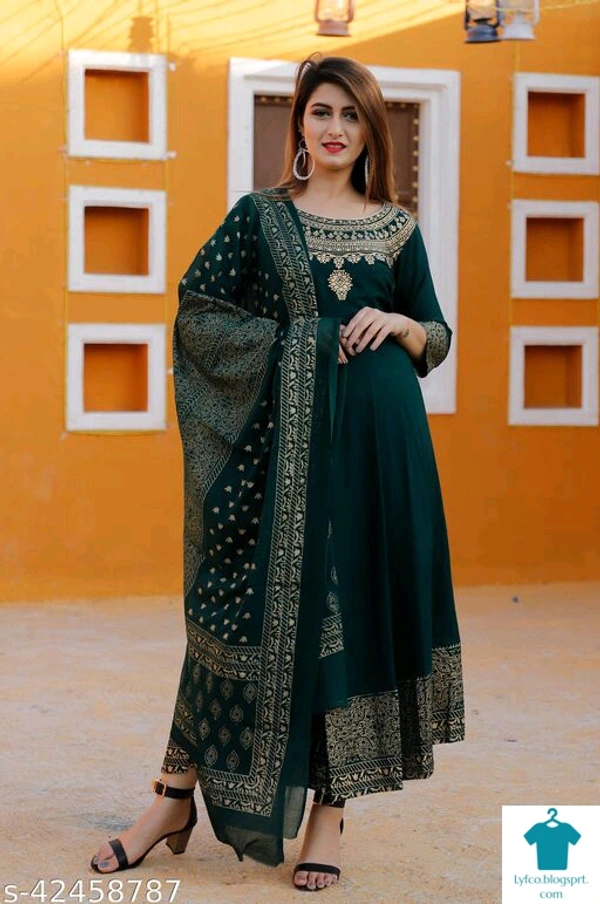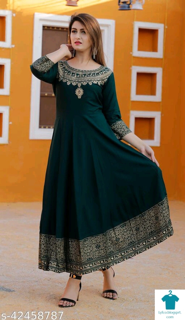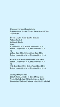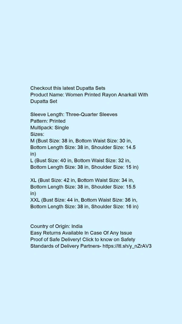 Product Name: *Women Printed Rayon Anarkali With Dupatta Set*Sleeve Length: Three-Quarter SleevesPattern: PrintedMultipack: Single