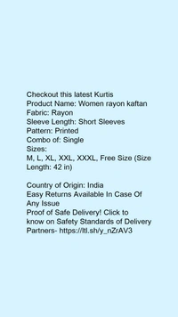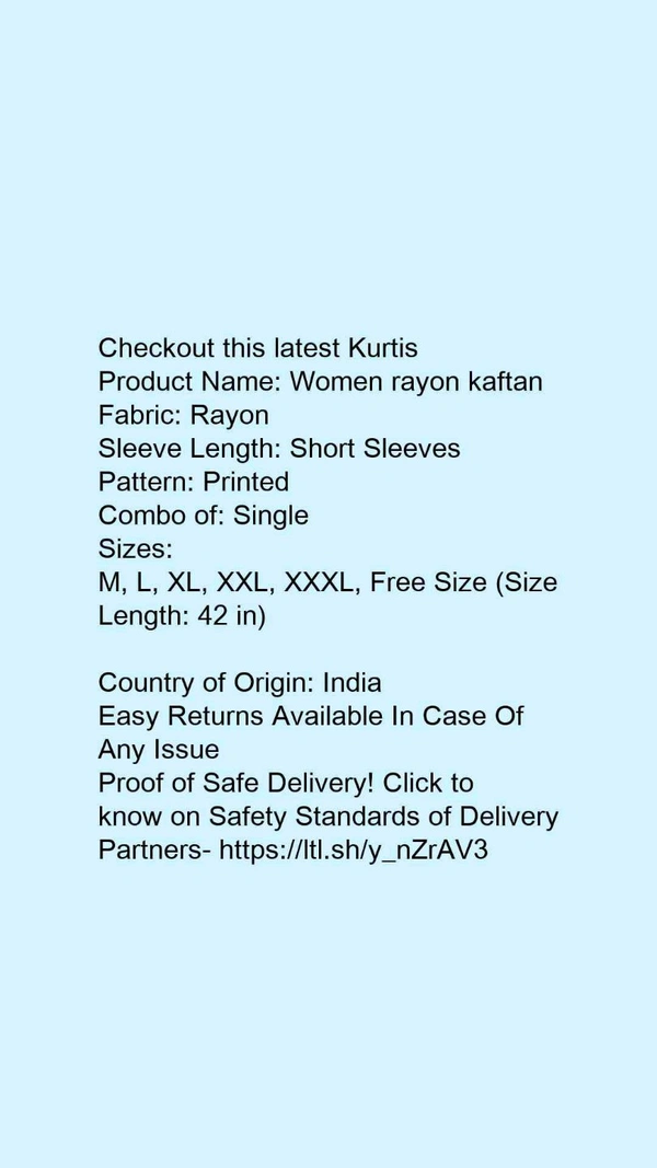 Product Name: *Women rayon kaftan*Fabric: RayonSleeve Length: Short SleevesPattern: PrintedCombo of: Single
