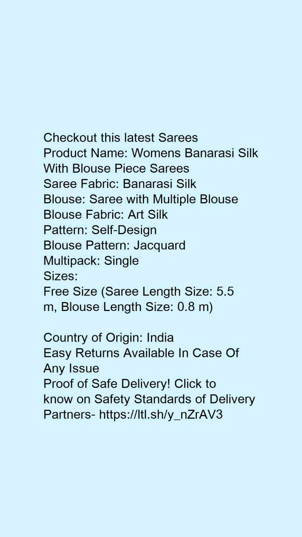Product Name: *Womens Banarasi Silk With Blouse Piece Sarees*Saree Fabric: Banarasi SilkBlouse: Saree with Multiple BlouseBlouse Fabric: Art SilkPattern: Self-DesignBlouse Pattern: JacquardMultipack: Single