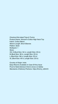 Product Name: *Women's Cotton High Neck Top*Fabric: Cotton BlendSleeve Length: Short SleevesPattern: SolidMultipack: 1