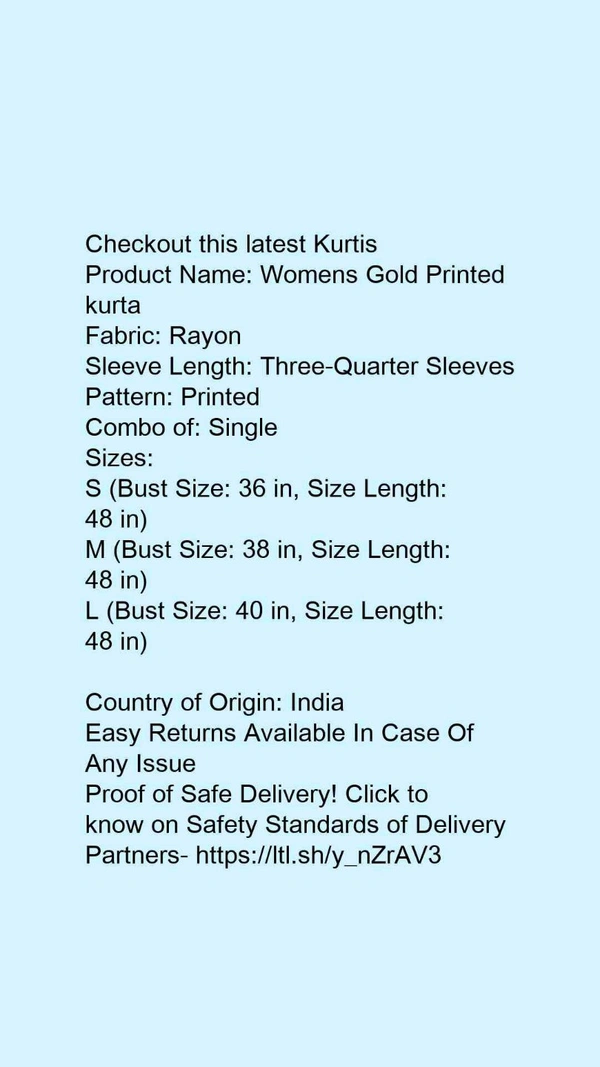 Product Name: *Womens Gold Printed kurta*Fabric: RayonSleeve Length: Three-Quarter SleevesPattern: PrintedCombo of: Single