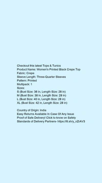 Product Name: *Women's Printed Black Crepe Top*Fabric: CrepeSleeve Length: Three-Quarter SleevesPattern: PrintedMultipack: 1