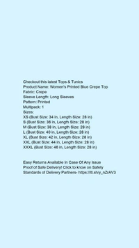 Product Name: *Women's Printed Blue Crepe Top*Fabric: CrepeSleeve Length: Long SleevesPattern: PrintedMultipack: 1