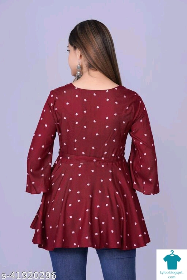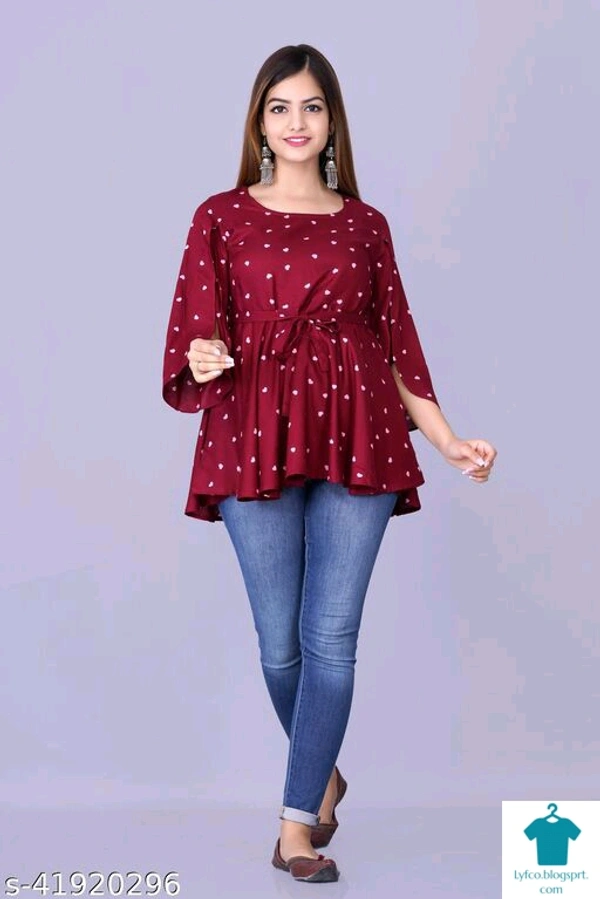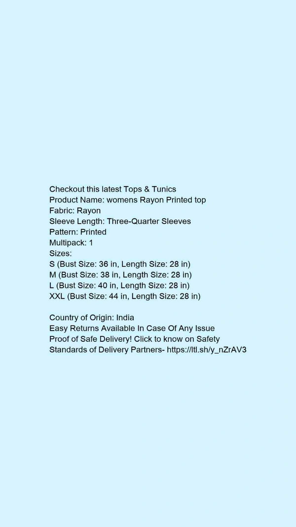 Product Name: *womens Rayon Printed top*Fabric: RayonSleeve Length: Three-Quarter SleevesPattern: PrintedMultipack: 1