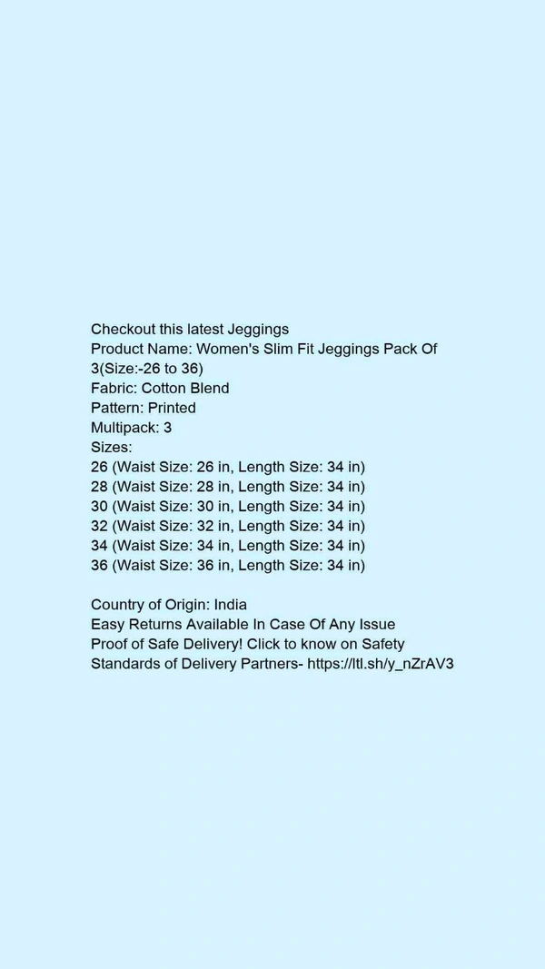 Product Name: *Women's Slim Fit Jeggings Pack Of 3(Size:-26 to 36)*Fabric: Cotton BlendPattern: PrintedMultipack: 3