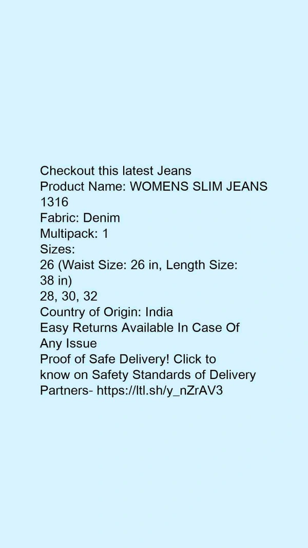 Product Name: *WOMENS SLIM JEANS 1316*Fabric: DenimMultipack: 1