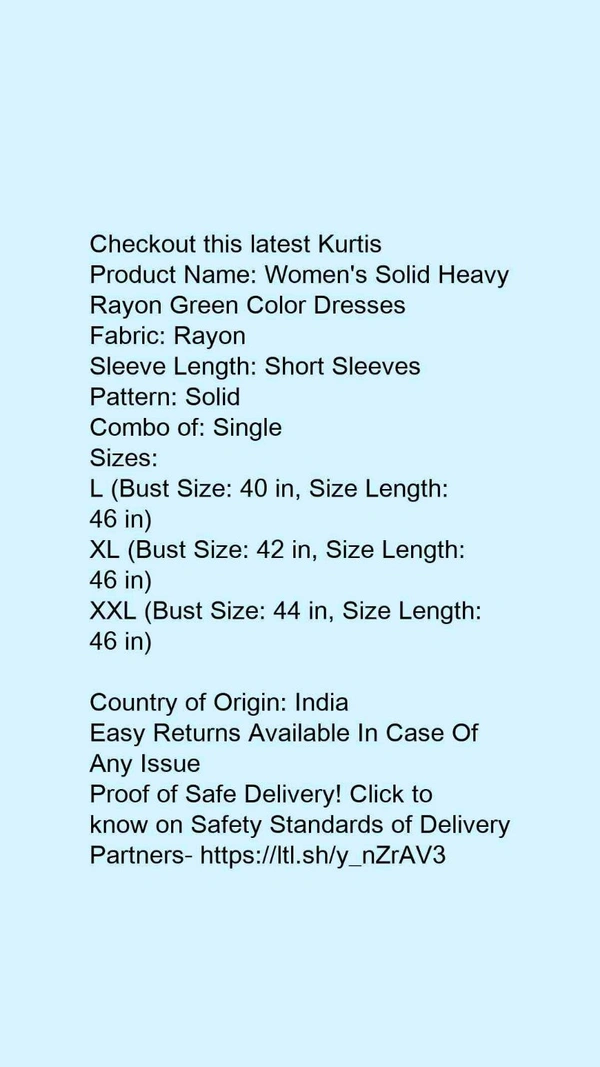 Product Name: *Women's Solid Heavy Rayon Green Color Dresses*Fabric: RayonSleeve Length: Short SleevesPattern: SolidCombo of: Single