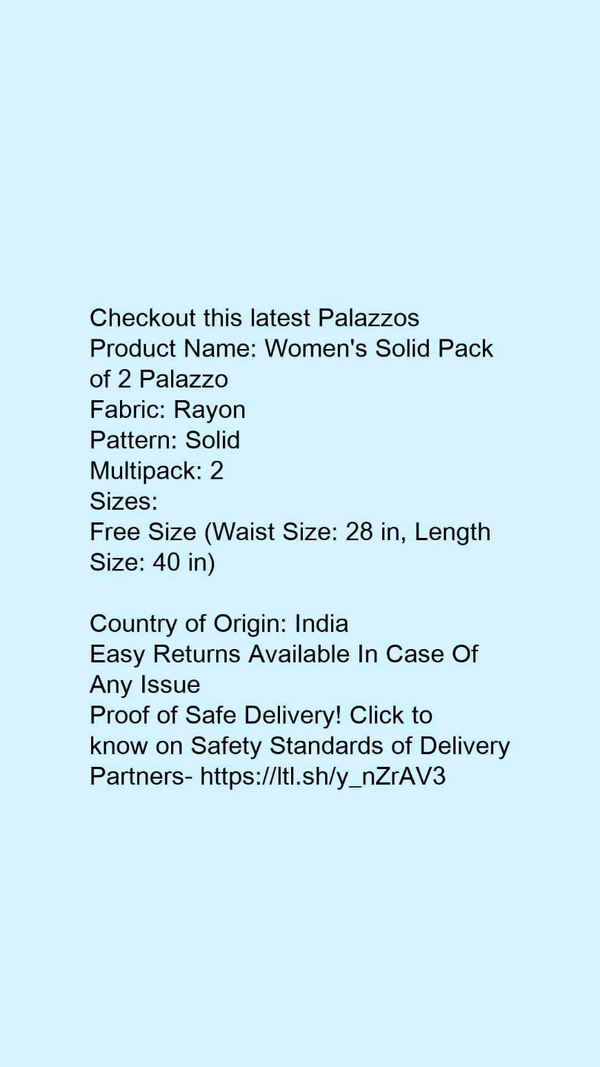 Product Name: *Women's Solid Pack of 2 Palazzo*Fabric: RayonPattern: SolidMultipack: 2