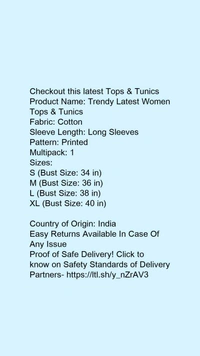 ☄️Urbane Glamorous Women Tops & TunicsFabric: CottonSleeve Length: Long SleevesPattern: PrintedMultipack: 1